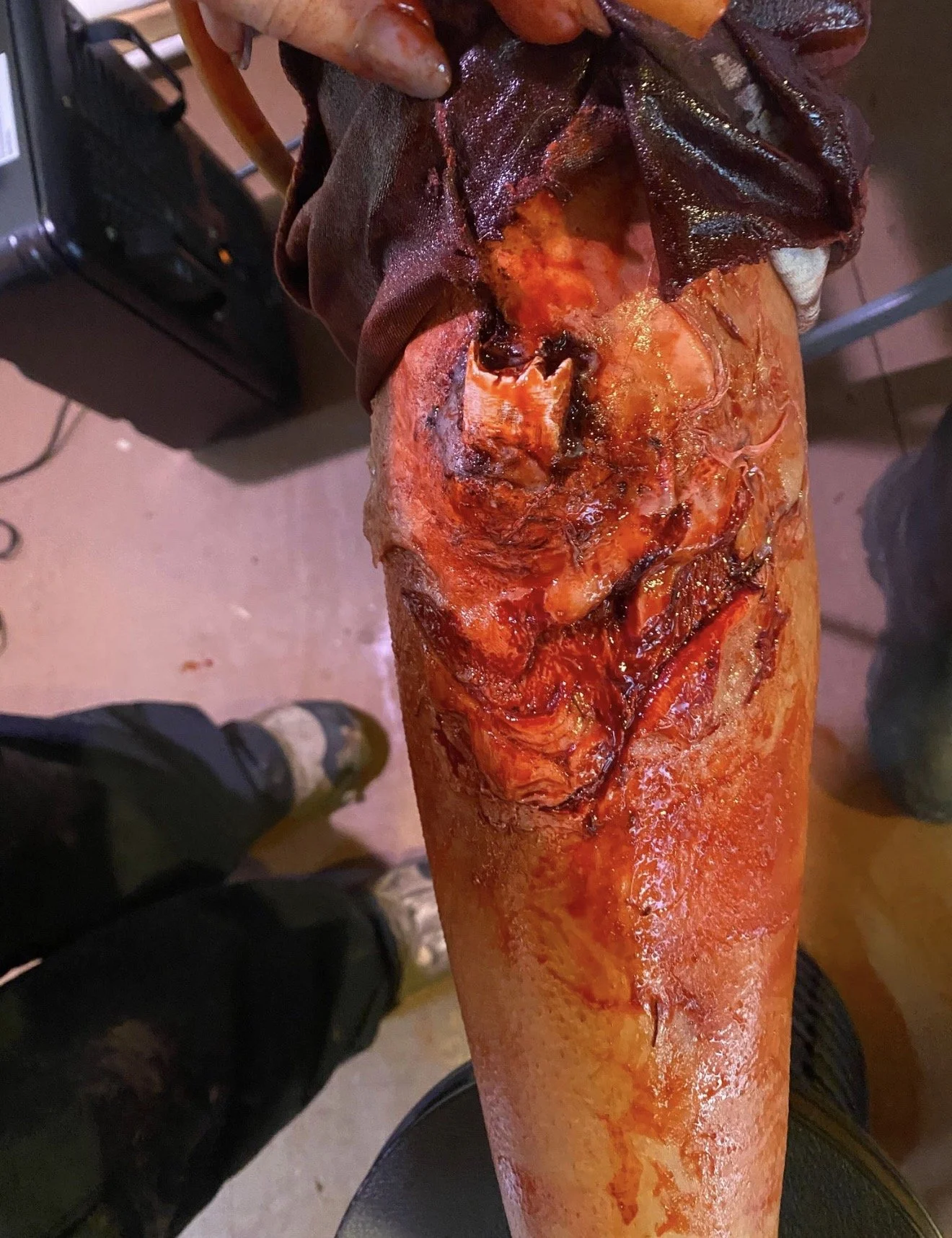 Process: Created a broken knee effect using a prosthetic layered with a blood bladder to simulate active blood flow. The system was powered by a blood pump operated by my assistant Ian, allowing for controlled, realistic movement on camera.